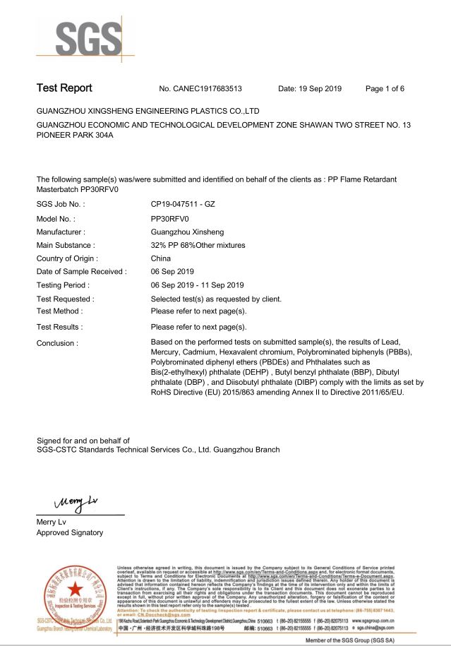 首页 >> 新闻资讯 >>行业动态 >> 塑料PP无卤阻燃剂母粒SGS报告